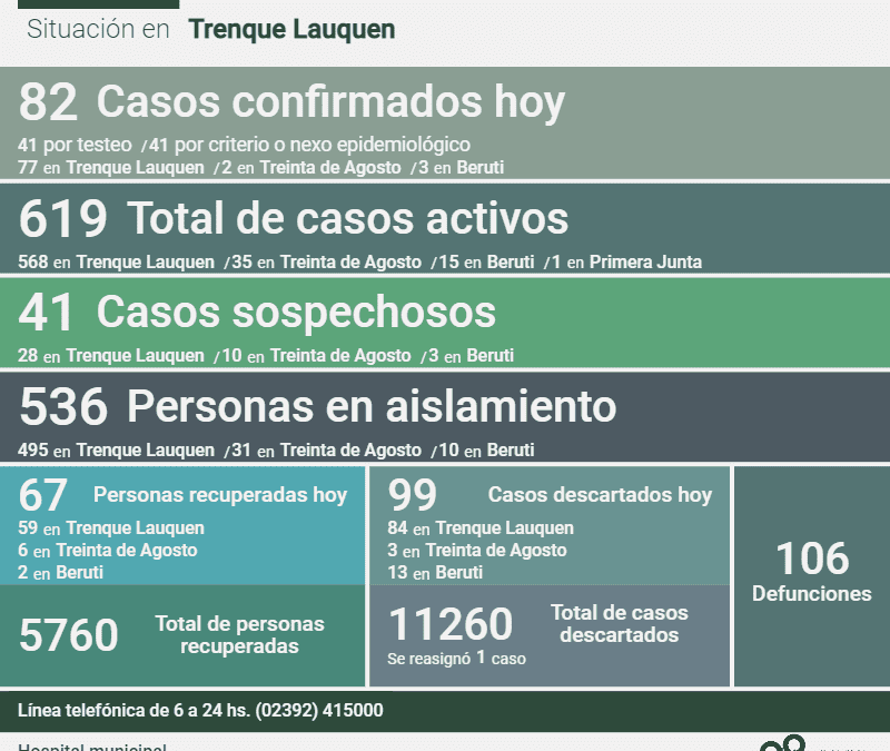 De los 82 nuevos casos positivos, 41 fueron detectados por testeo y 41 por criterio o nexo epidemiológico según protocolo actualizado vigente, y 77 corresponden a Trenque Lauquen, dos (2) a Treinta de Agosto y tres (3) a Beruti.