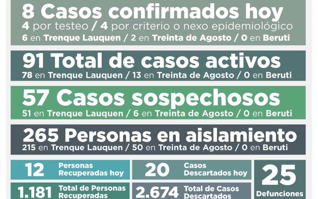 De los ocho (8) nuevos casos confirmados, seis (6) corresponden a Trenque Lauquen –dos (2) por hisopado y cuatro (4) por nexo- y dos (2) a Treinta de Agosto –ambos por testeo-.