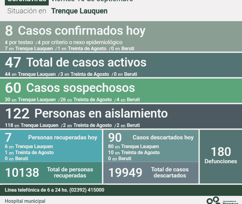Hay 122 personas en aislamiento, 118 de Trenque Lauquen, dos (2) de Treinta de Agosto y dos (2) de Beruti, y quedan 60 casos sospechosos, 30 de la ciudad cabecera, 26 de Treinta de Agosto y cuatro (4) de Beruti.