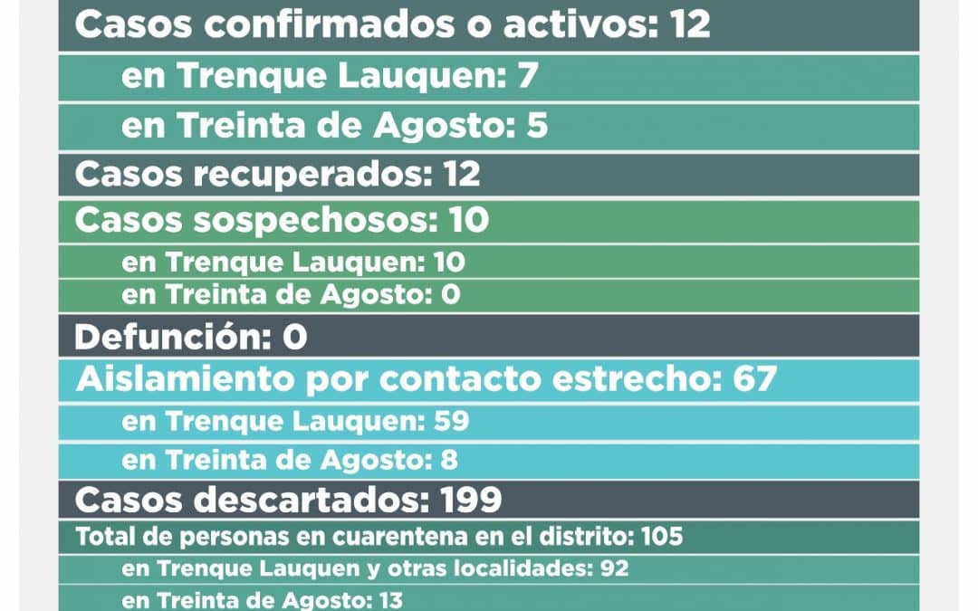 A la fecha, los casos confirmados o activos ascienden a 12, siete (7) de Trenque Lauquen y cinco (5) de Treinta de Agosto, mientras que los descartados son 199.