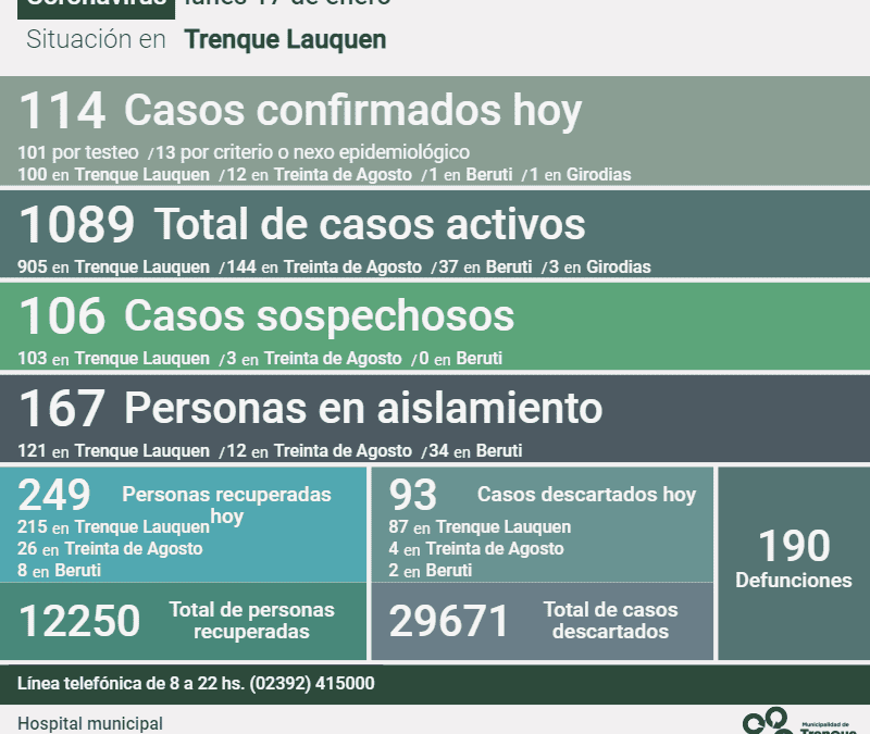 De los 114 nuevos casos positivos, 101 fueron diagnosticados por hisopado y los restantes 13 por nexo o criterio epidemiológico, y del total, 100 pertenecen a Trenque Lauquen, 12 a Treinta de Agosto, uno (1) Beruti y uno (1) a Girodías.