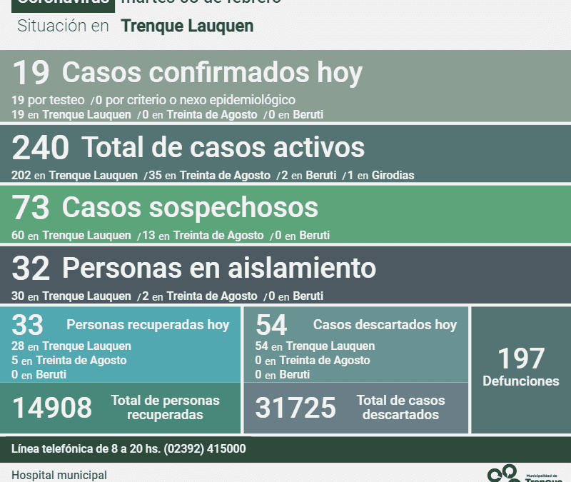 La subsecretaría de Salud municipal reportó esta mañana (martes) 19 nuevos casos confirmados de Covid-19, otras 33 personas recuperadas y 54 casos descartados más, siendo hoy 240 los casos activos en el distrito y quedando 32 personas en aislamiento y 73 casos sospechosos.