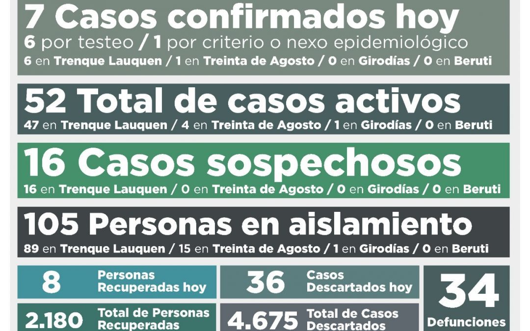 Siete (7) nuevos casos de Covid-19 confirmados -seis (6) por testeo y uno (1) por criterio o nexo epidemiológico según protocolo actualizado vigente-, ocho (8) personas recuperadas más y otros 36 casos descartados fueron informados esta mañana (viernes) por la subsecretaría de Salud municipal, que con estos datos reportó un total de activos de 52. Además hay 16 casos sospechosos y 105 personas en aislamiento en todo el distrito.