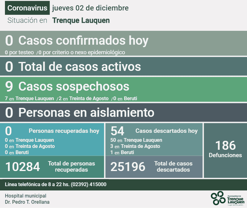 El distrito de Trenque Lauquen sigue sin casos activos de Covid-19, según informó esta mañana (jueves) la subsecretaría de Salud municipal que reportó 54 casos descartados y nueve (9) casos sospechosos a la espera del resultado de las muestras.