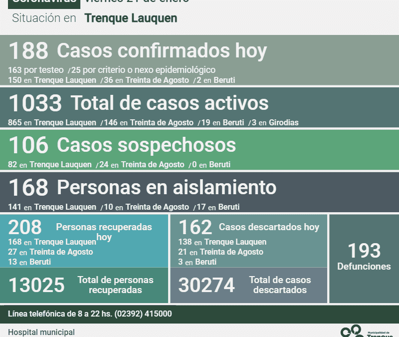 De los 188 nuevos casos positivos, 163 fueron diagnosticados por hisopado y los restantes 25 por nexo o criterio epidemiológico, y del total, 150 pertenecen a Trenque Lauquen, 36 a Treinta de Agosto y dos (2) a Beruti.