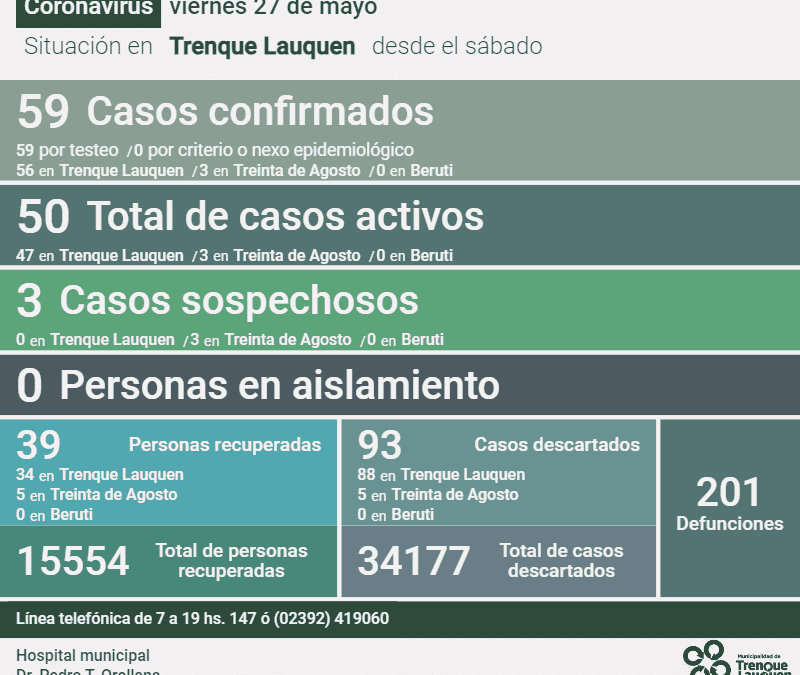 Los 59 nuevos casos positivos fueron confirmados por testeo, de los cuales 56 corresponden a Trenque Lauquen y tres (3) a Treinta de Agosto.