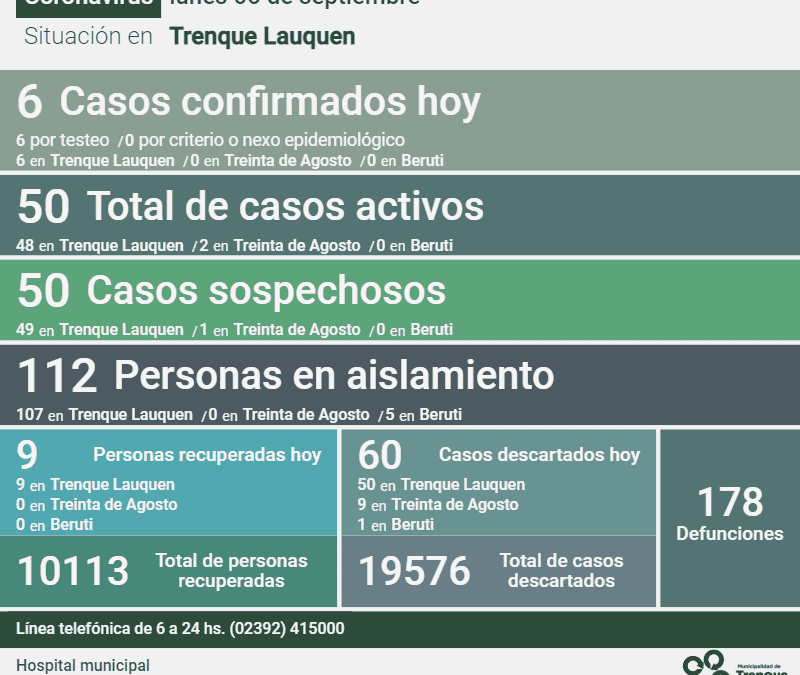 Hay 112 personas en aislamiento, 107 de Trenque Lauquen y cinco (5) de Beruti, y quedan 50 casos sospechosos, 49 de la ciudad cabecera y uno (1) de Treinta de Agosto.