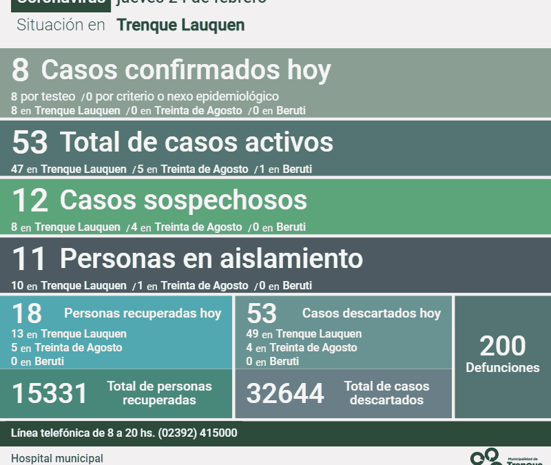 Quedan en aislamiento 11 personas, 10 de Trenque Lauquen y una (1) de Treinta de Agosto, y 12 casos sospechosos, ocho (8) de la ciudad cabecera y cuatro (4) de Treinta de Agosto; de los cuales 10 se encuentran en sus domicilios y uno (1) en el Hospital Municipal.