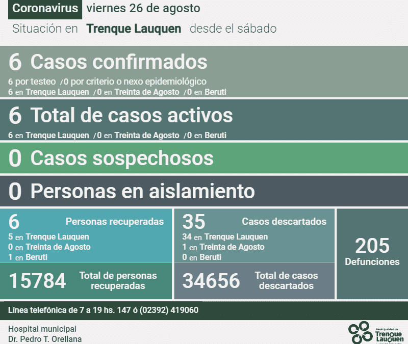 Los seis (6) nuevos casos positivos fueron confirmados por testeo y corresponden a la ciudad cabecera, y los seis (6) casos activos pertenecen a Trenque Lauquen, encontrándose cinco (5) en sus domicilios y uno (1) en el Hospital Municipal.