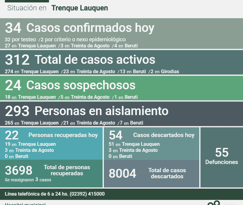 De los 34 nuevos casos positivos, 32 se detectaron por hisopado y dos (2) por nexo o criterio epidemiológico según protocolo actualizado vigente, de los cuales 27 corresponden a Trenque Lauquen, tres (3) a Treinta de Agosto y cuatro (4) a Beruti.
