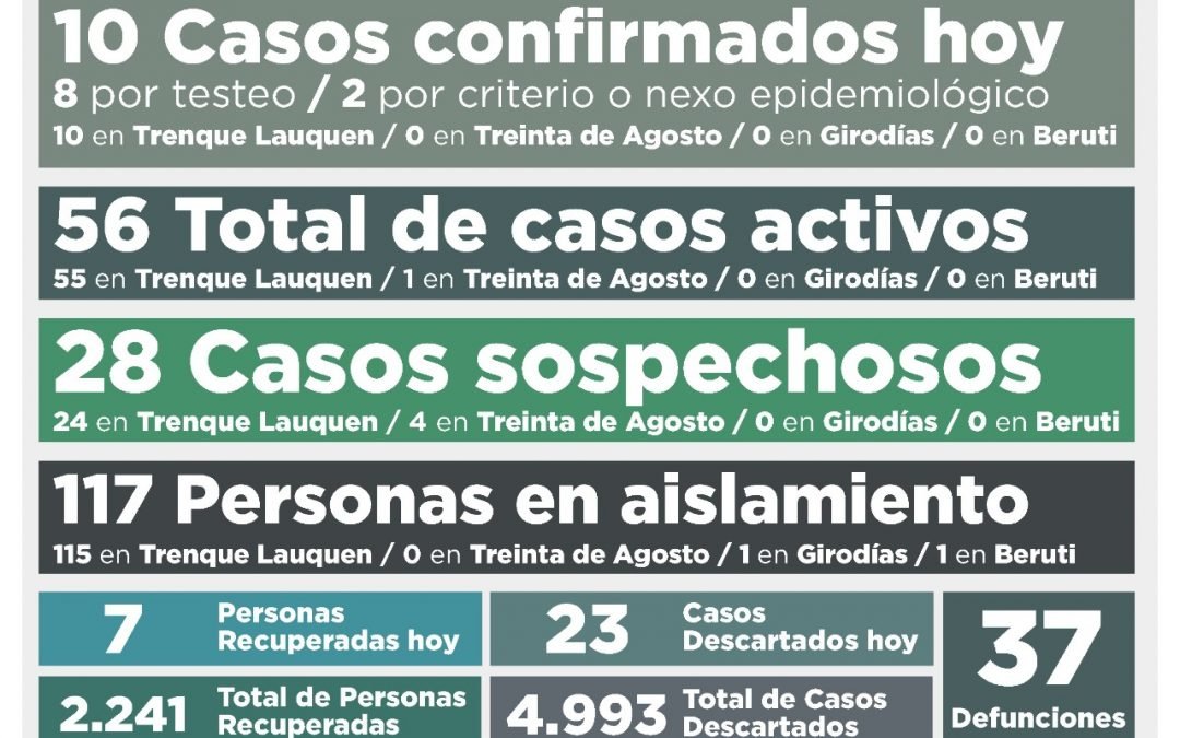 De los diez (10) nuevos casos confirmados, todos de Trenque Lauquen, ocho (8) fueron detectados por testeo y dos (2) por nexo o criterio según protocolo actualizado vigente.