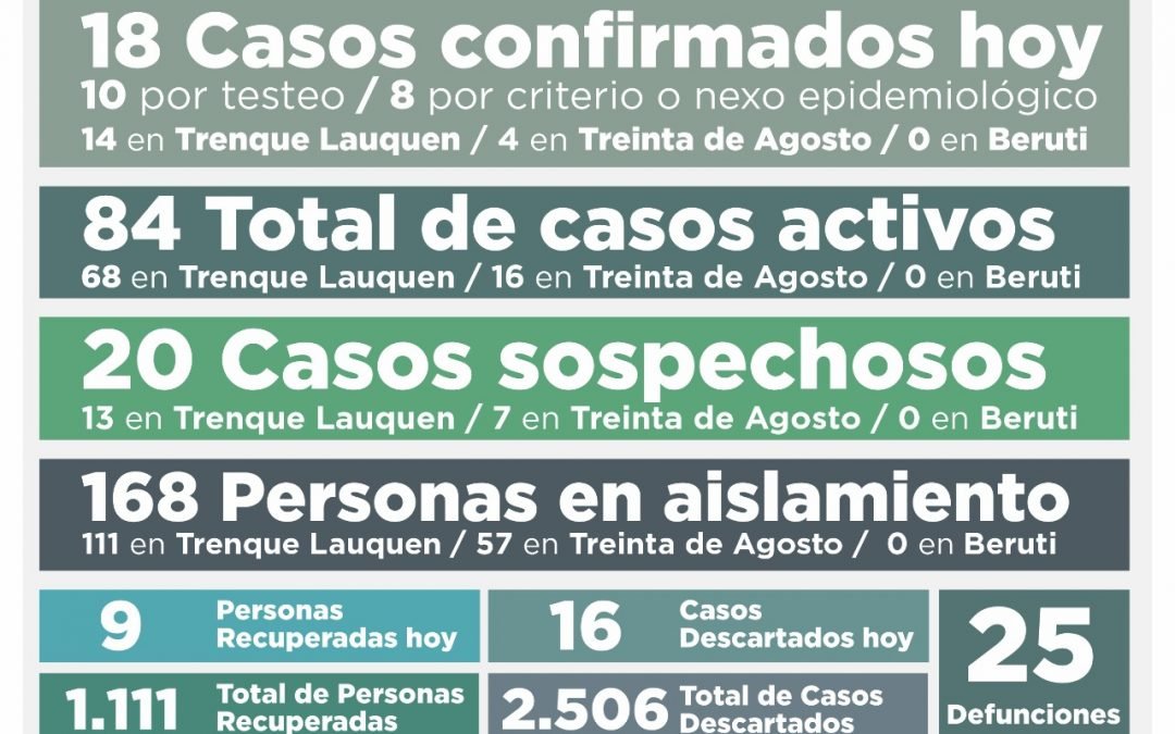 De los 18 nuevos casos confirmados, 14 corresponden a Trenque Lauquen –diez (10) por testeo y cuatro (4) por nexo- y cuatro (4) a Treinta de Agosto –todos por nexo-.