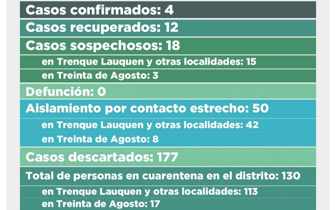 La cantidad de casos descartados ascendió a 177 y se mantienen los cuatro (4) casos confirmados, tres (3) de Trenque Lauquen, que se encuentran en el Hospital Dr. Pedro T. Orellana, y uno (1) de Treinta de Agosto, en el Hospital Dr. Francisco Eguiguren, mientras que siguen siendo 12 los casos recuperados.