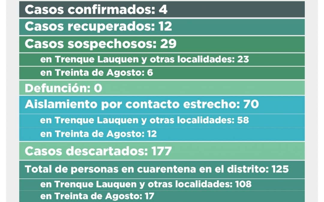 En aislamiento por contacto estrecho hay 70 personas, 58 en Trenque Lauquen y 12 en Treinta de Agosto, mientras que son 125 las que permanecen en cuarentena, 108 en Trenque Lauquen y otras localidades y 17 en Treinta de Agosto. Ya fueron dadas de alta otras 2,091.