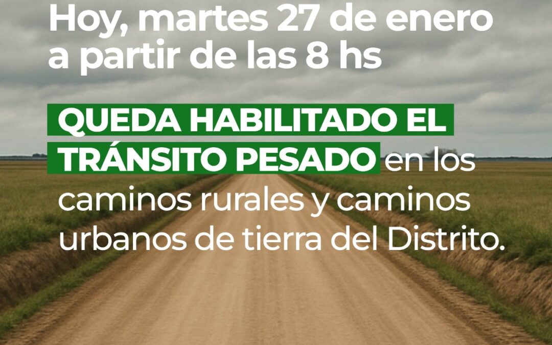 Las direcciones de Caminos Rurales y de Conservación de Caminos Urbanos del Municipio informan que a partir de las 8 de hoy (martes) quedan habilitados al Tránsito Pesado los caminos rurales y los caminos de tierra urbanos de todo el distrito (comprendiendo la medida los XVI cuarteles).