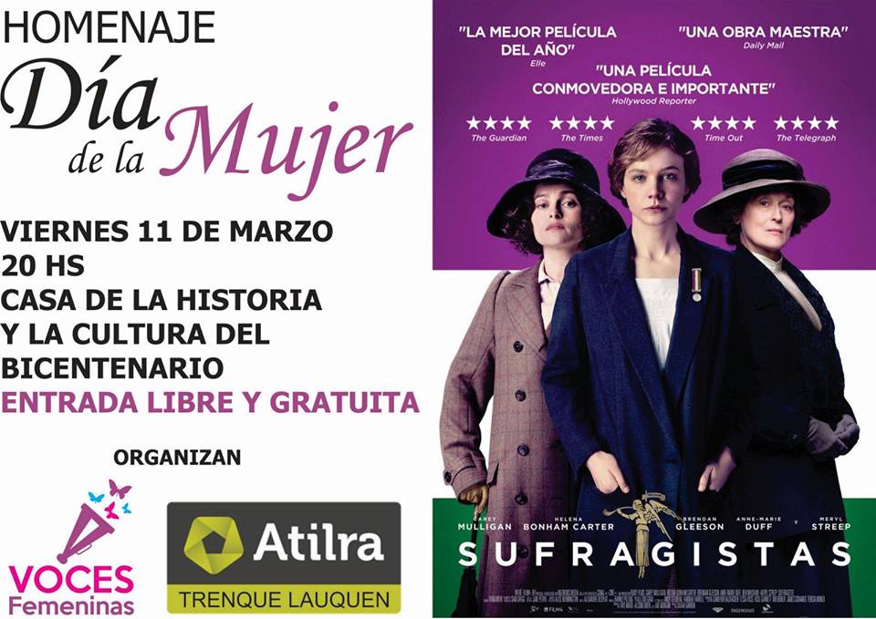 En el marco de las actividades por el Día Internacional de la Mujer, el Municipio informa que mañana (viernes) a partir de las 20 hs. en la Casa de la Historia y la Cultura se proyectará la película “Sufragistas”.