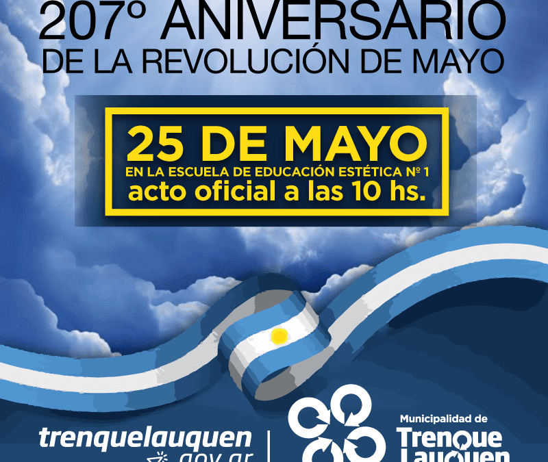 La Municipalidad de Trenque Lauquen informa que el jueves 25 de mayo a las 10 hs. se realizará el acto oficial por el 207º Aniversario de la Revolución de Mayo que se realizará en la Escuela de Educación Estética Nº 1.