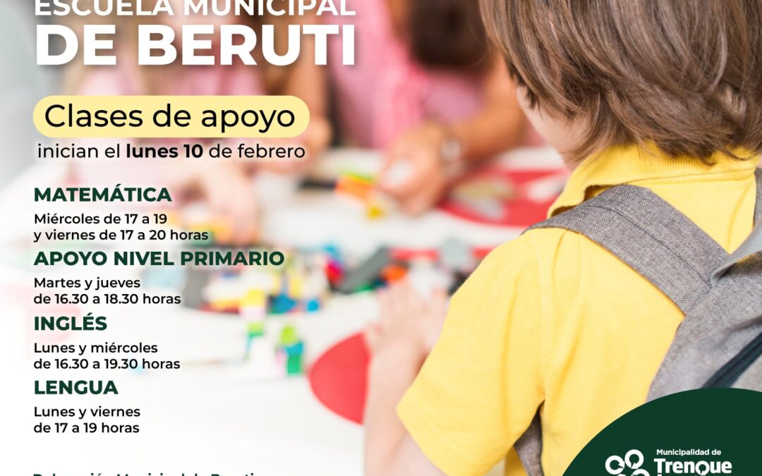 El lunes próximo (10) comenzarán las clases de Apoyo Escolar para alumnos/as de los niveles Primario y Secundario en la Escuela Municipal de Beruti, que funciona en el Centro Cultural La Estación.
