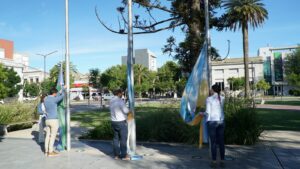 Durante el acto se realizó el izamiento de banderas y se entonaron las estrofas del Himno Nacional Argentino.
