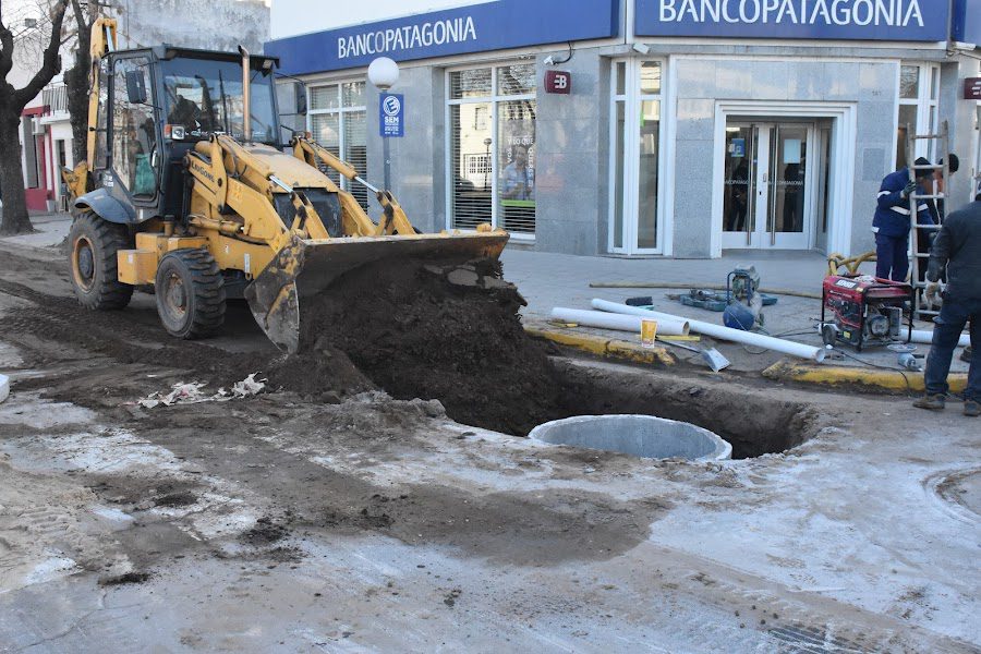 Personal y maquinarias de la dirección de Servicios Sanitarios de la municipalidad de Trenque Lauquen se encuentran trabajando en la esquina de Roca, entre Uruguay y Nueve de Julio (vereda par), donde se avanza con el recambio de dos cámaras de la red de cloacas (se dañaron por el paso del tiempo) y con la ejecución del ramal de conexión.