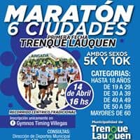 El próximo sábado se realizará en Trenque Lauquen la primera fecha del maratón “6 Ciudades” con una distancia de 5 y 10 Km. Se trata de un circuito céntrico de 2550 metros y las categorías van desde los 18 años en adelante para ambos sexos. La inscripción se realiza sólo desde el Facebook de gymmos timing Villegas hasta el viernes 14 a las 22 hs.