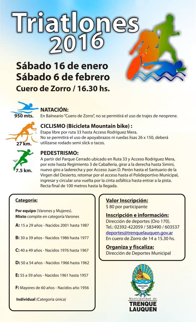 La Municipalidad de Trenque Lauquen a través de la Dirección de Deportes informa que el próximo sábado (16) se realizará un triatlón en Cuero de Zorro a partir de las 16.30 hs.