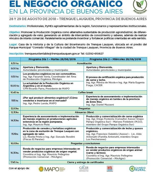 Dos jornadas sobre Producción Orgánica de origen vegetal y animal (carne, tambo y leche) que incluyen rondas de negocios para empresas interesadas en comercializar productos de este tipo se realizarán mañana (martes) y pasado (miércoles) en la Casa de la Historia y de la Cultura del Bicentenario de Trenque Lauquen, con la organización de la secretaría de Alimentos y Bioeconomía del ministerio de Agroindustria de la Nación, en forma conjunta con la Provincia de Buenos Aires y el municipio de Trenque Lauquen, a través de la Oficina de Economía Social de la secretaría de Producción y de la dirección de Ambiente y Desarrollo Sustentable.
