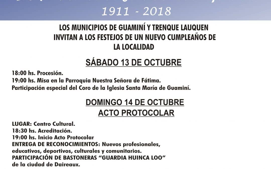 Los Municipios de Guaminí y Trenque Lauquen compartirán el fin de semana próximo los festejos por el 107° aniversario de Garré (1911-2018): El sábado a las 18 hs. habrá una procesión y a las 19 hs. una misa en la Parroquia Nuestra Señora de Fátima, con la participación del Corto de la Iglesia Santa María de Guaminí, y el domingo a las 17.30 hs. la inauguración de la obra El Triángulo del Hilo, que corresponde al Presupuesto Participativo 2017/2018, y a las 19 hs. el acto protocolar.