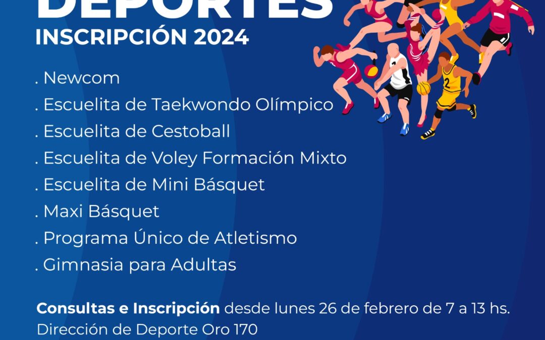 Ocho de las muchas actividades que se realizan bajo la órbita de la dirección de Deporte municipal abren el próximo lunes (26) la inscripción para sus talleresde la temporada 2024: son el Newcom;las escuelitas de Taekwondo Olímpico, Cestoball, Mini Basquet y Voley Formativo Mixto; el Programa Único de Atletismo (PÚA); el Maxi Basquet; y Gimnasia para Adultas algunos de ellos en más de una sede.