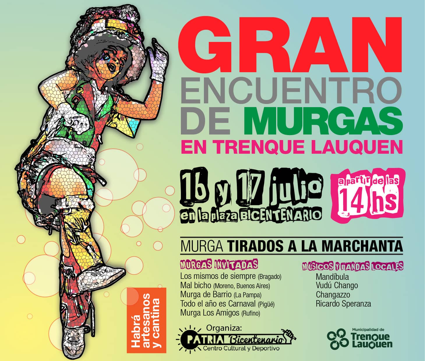 La Municipalidad de Trenque Lauquen auspicia el Gran Encuentro de Murgas que se desarrollará en Trenque Lauquen los días 16 y 17 de julio en la plaza del Bicentenario, ubicada entre las calles Salta, Pettiná, Orellana y Alende.