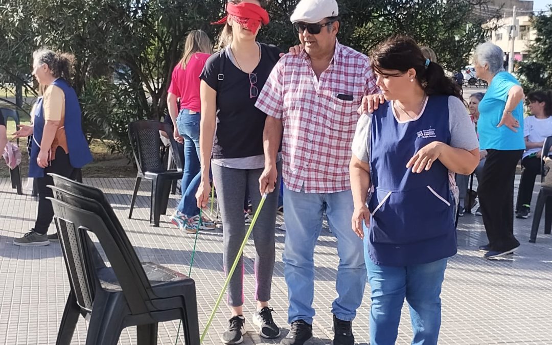 En Plaza San Martín ayer (viernes) y junto a Carolina Trinchieri, Sol Rodríguez y Karina Gallardo, coordinadora del CAPS Ameghino, compartieron una tarde de gimnasia, bailes, mates y facturas en la que además invitaron a muchos vecinos/as que pasaban a participar de un “juego” de concientización y empatía: les vendaban los ojos y les entregaban un bastón para acompañarlos a caminar por un circuito con diferentes obstáculos, esos que a diario deben sortear por las calles y veredas de la ciudad quienes son no videntes -el 15 de octubre fue el Día del Bastón Blanco- o tienen una visión limitada -el 26 de septiembre fue el Día del Bastón Verde-.
