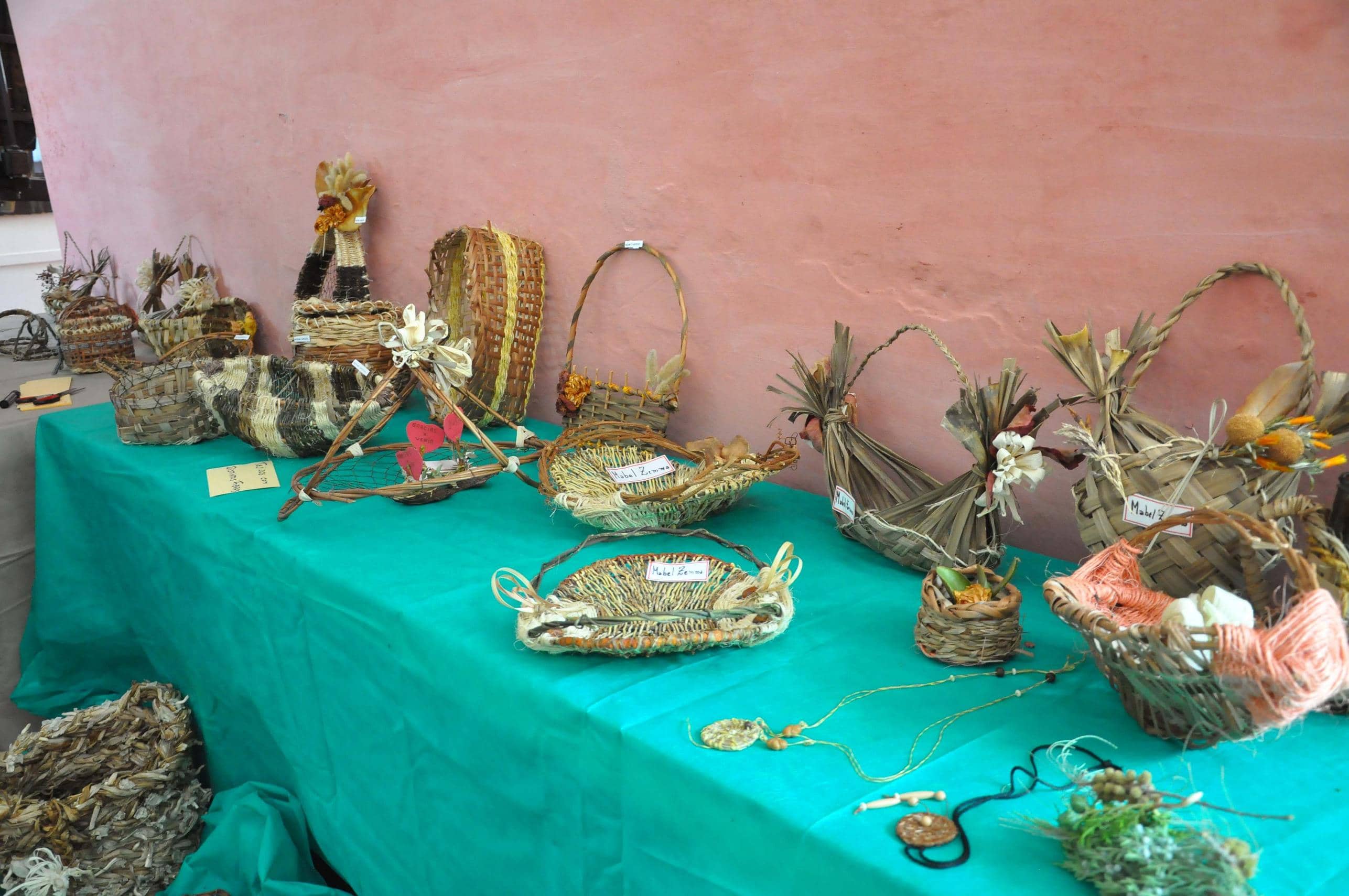 La exposición presenta diferentes trabajos tejidos con Dracena, Mimbre, Hojas de totora, Ristra de ajo y Pinocha entre otros.