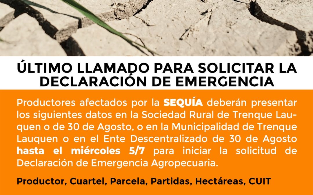 Los productores tendrán plazo para ingresar en el mencionado hasta pasado mañana (miércoles 5), presentándose con los requerimientos necesarios –Productor, Cuartel/es, Parcela/s, Partida/s, Hectáreas y CUIT- en la municipalidad de Trenque Lauquen, en el Ente Descentralizado de 30 de Agosto o en las Sociedades Rurales de Trenque Lauquen o 30 de Agosto para iniciar la solicitud de Declaración de Emergencia Agropecuaria.
