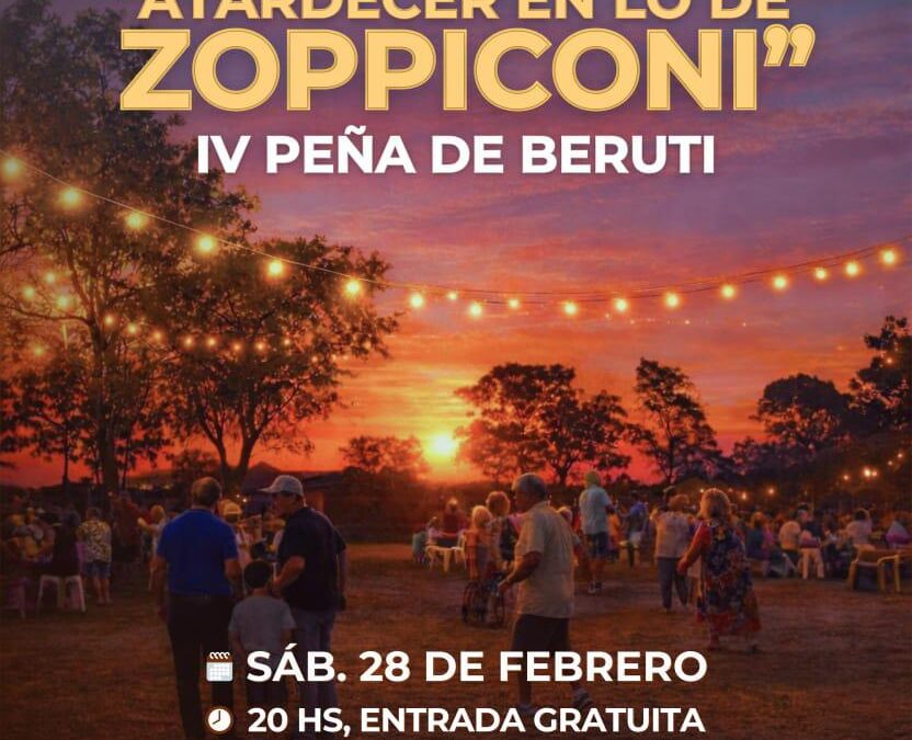 El próximo sábado (28) se realizará la IV Peña de Beruti “Atardecer en lo de Zoppiconi”, un evento que tendrá música, puestos de artesanos y buen servicio de cantina para pasar una linda noche.