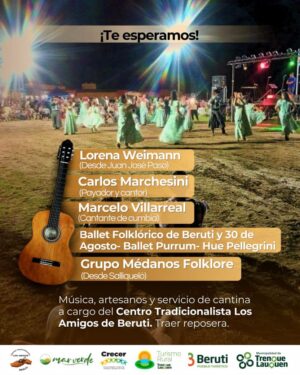 La actividad está prevista para las 20 en el predio Zoppiconi con entrada gratuita y es organizada por el grupo Crecer, Mar Ver, Turismo Rural, Centro Tradicionalista Los Amigos de Beruti, la Municipalidad de Trenque Lauquen y la Delegación de Beruti.