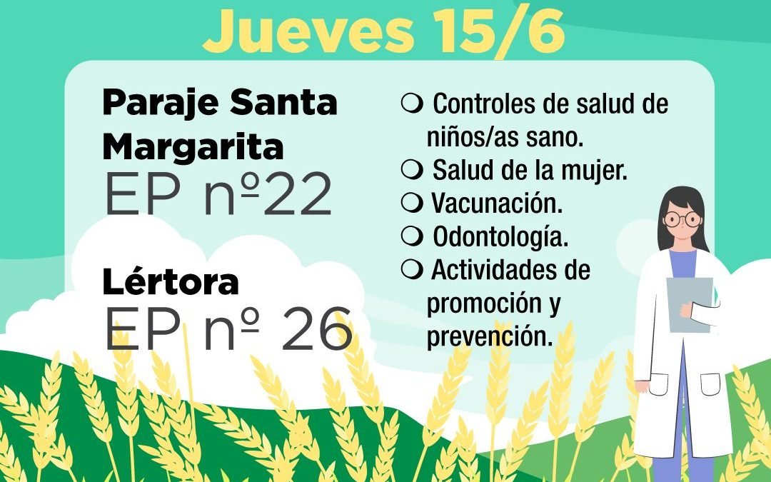 En otra propuesta destinada a las familias que viven en el ámbito rural, mañana (jueves) habrá una jornada de Salud Rural en el paraje Santa Margarita, con epicentro en la Escuela nº 22 y en Lértora, en instalaciones de la Escuela nº 26.