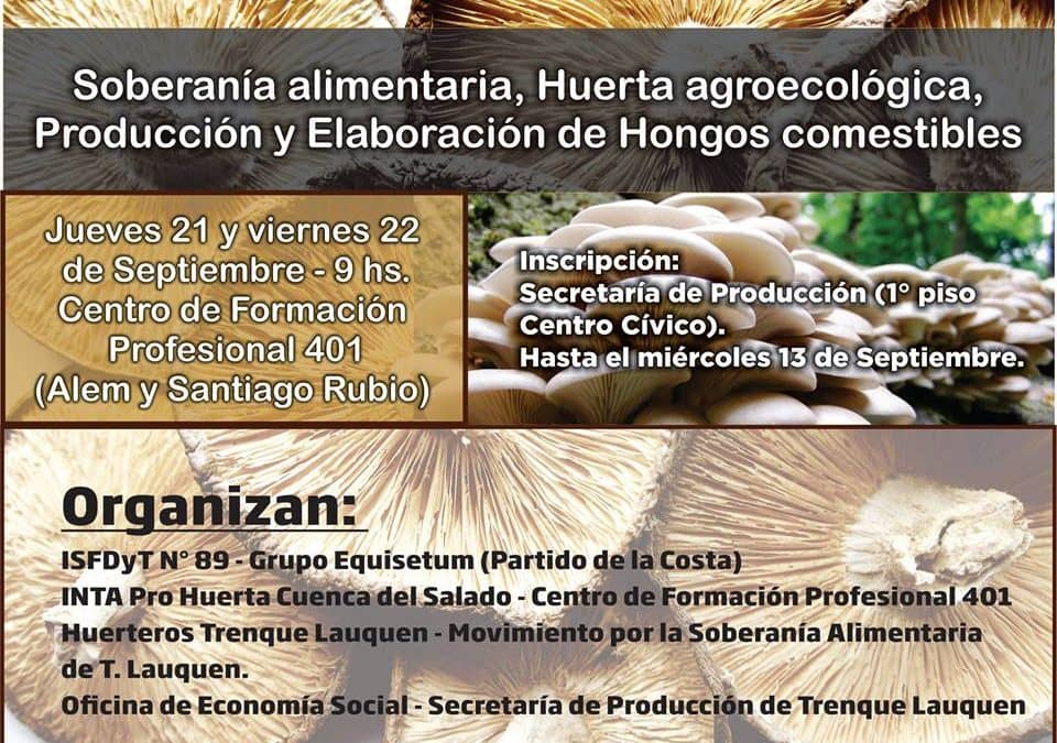 La Municipalidad de Trenque Lauquen recuerda que este jueves (21) comenzarán a desarrollarse en la ciudad las Jornadas de Capacitación sobre Soberanía Alimentaria, Huerta Agroecológica y Producción y Elaboración de Hongos Comestibles, en las instalaciones del Centro de Formación Profesional 401, ubicado en Alem y Santiago Rubio.