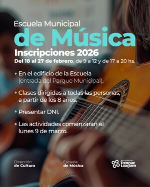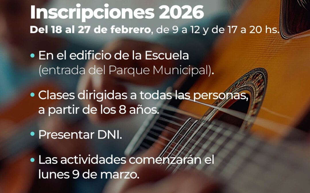 La Escuela Municipal de Música abrirá la inscripción para sus clases anuales desde el miércoles 18 hasta el viernes 27 de febrero, de 9 a 12 y de 17 a 20 en su edificio, ubicado en la entrada del Parque Municipal “Conrado Villegas”.