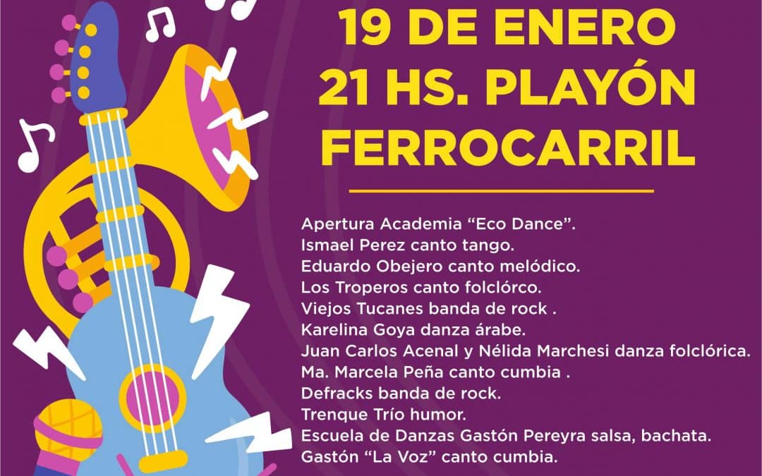 Después de la apertura de la Academia EcoDance, que dirige la profesora María José Palomeque, subirán al escenario en forma sucesiva Ismael Pérez (cante de tango); Eduardo Obejero (melódico); Los Troperos (folclore); y Viejos Tukanes (rock).