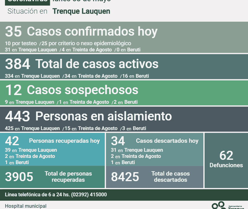 De los 35 nuevos casos confirmados, diez (10) por hisopado y 25 por criterio o nexo epidemiológico de acuerdo al protocolo actualizado vigente, 31 pertenecen a Trenque Lauquen y cuatro (4) a Treinta de Agosto.