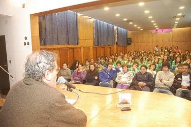 Con el auditorio del Centro Cívico repleto, el escritor propuso una charla abierta que se prolongó por más de 2 horas, abordando las temáticas mencionadas y respondiendo las distintas inquietudes planteadas por los alumnos al respecto del Proyecto de Ley de Servicios Audiovisuales y los intereses económicos inherentes a las corporaciones mediáticas entre otros puntos tratados durante la mañana.