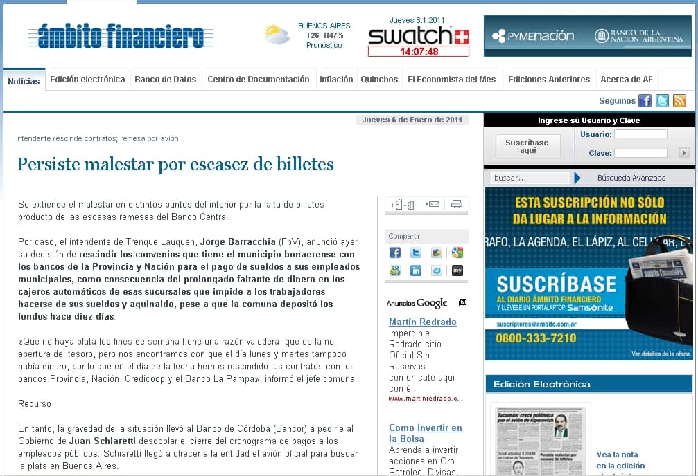 El diario Ámbito Financiero dedica al tema una nota en la página 18, con el título “Persiste malestar por escasez de billetes”, en la que se destaca en la volanta que “Intendente rescinde contratos”.