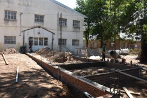 La obra de refacción de pisos en el edificio de la Escuela Primaria nº 1 avanza a buen ritmo con el rellenado y compactado de tierra en la planta baja, mientras que en la planta alta se están desarmando los pisos de madera, recuperando la pinotea original para poder reutilizarla.