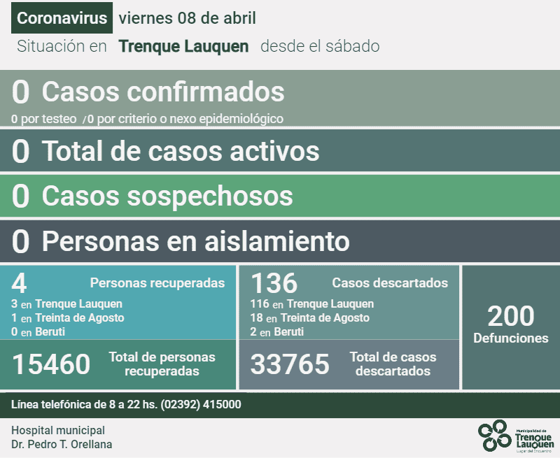 También se descartaron 136 casos: 116 de Trenque Lauquen, 18 de Treinta de Agosto y dos (2) de Beruti, siendo 33.765 los descartados desde el inicio de la pandemia a la fecha.