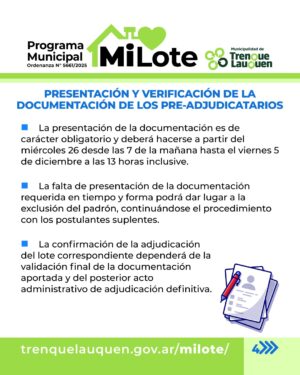 El Programa Municipal Mi Lote inicia mañana (miércoles 26) una nueva etapa donde las personas pre-adjudicatarias favorecidas como titulares en el sorteo público realizado con el padrón definitivo deberán presentar la documentación solicitada por la Municipalidad de Trenque Lauquen para luego ser verificada por las áreas correspondientes, siendo este el paso previo obligatorio a la adjudicación definitiva, conforme lo establecido por la Ordenanza N° 5661/2025.