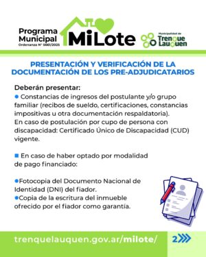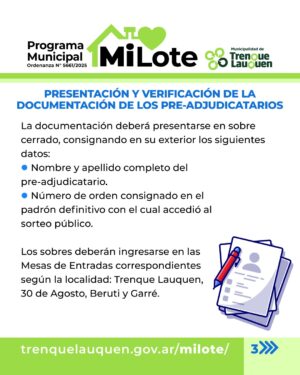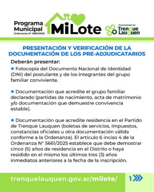 El Programa Municipal Mi Lote inicia mañana (miércoles 26) una nueva etapa donde las personas pre-adjudicatarias favorecidas como titulares en el sorteo público realizado con el padrón definitivo deberán presentar la documentación solicitada por la Municipalidad de Trenque Lauquen para luego ser verificada por las áreas correspondientes, siendo este el paso previo obligatorio a la adjudicación definitiva, conforme lo establecido por la Ordenanza N° 5661/2025.