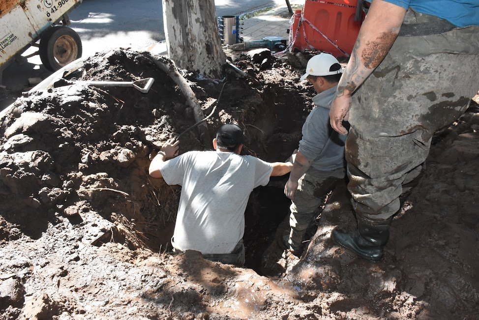 Acerca de las tareas realizadas explicó que “la excavación se hizo a mano, porque es una zona por donde pasan caños de fibra óptica y raíces grandes de árboles, y nos encontramos con que se había roto el ‘manguito’, la pieza que une los dos tramos sucesivos de caño”.