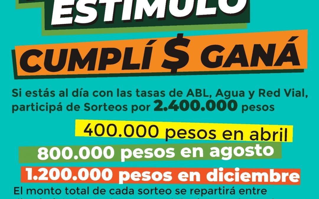 Está previsto entregar mediante tres sorteos a realizarse en el año un total de 2.400.000 pesos entre aquellos vecinos que estén al día con las tasas de ABL, Agua y Red Vial o que ya tengan o suscriban convenios de pago por las mismas y estos se encuentren vigentes con cumplimiento.