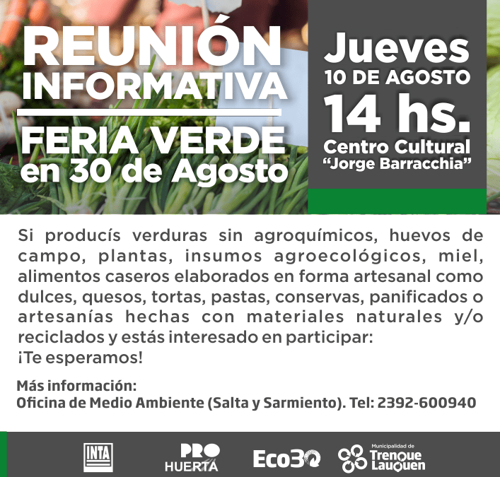 La Oficina de Medio Ambiente del Ente Descentralizado 30 de Agosto convoca a una reunión informativa, que se realizará el jueves 10 de agosto a las 14 horas en el Centro Cultural “Jorge Barracchia”, para la organización de la “Feria Verde, del productor al consumidor”.