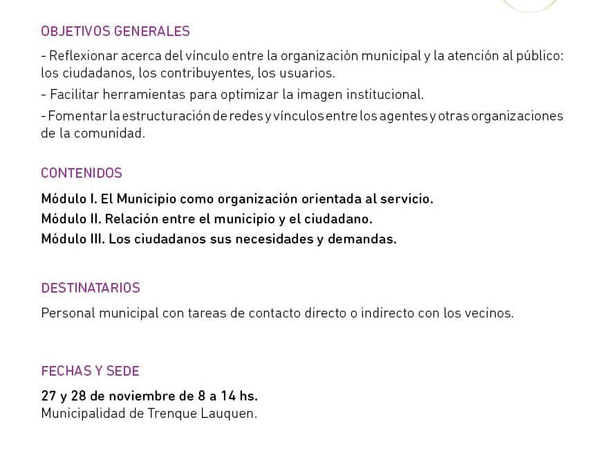 La Municipalidad de Trenque Lauquen a través de la Dirección de Recursos Humanos abrió la inscripción para la Capacitación de Atención al Ciudadano dictado por el IPAP y destinado al personal municipal con tareas de contacto directo o indirecto con los vecinos,